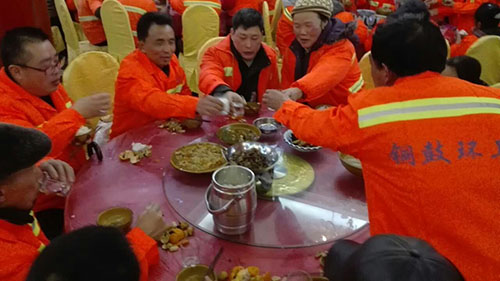 江西省宜春市在2015年遭遇了“世纪寒潮”的冬天。当人们选择躲在温暖的室内时,环卫工人们却仍然顶着凛冽的寒风坚守岗位。年关将至,宜春又将迎来一轮恶劣的雨雪天气,他们为了群众的出行方便,坚持奋斗在线。2月2日晚上,为了表示对环卫工人们的关爱与敬意,尚客优酒店铜鼓街心花园店三位老总胡尔凤、黄伟、曾雪平邀请全县一百三十多位环卫工人们相聚在一起,提前吃了个“年夜饭”。这是尚客优铜鼓街心花园店连续两年请环卫工人吃“年夜饭”了。
